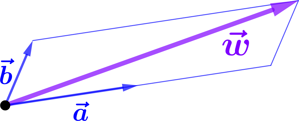 There is no requirement that the basis vectors \(\aa\) and \(\bb\) used in the expansion be “perpendicular”, nor that they have the same “magnitude”. In fact, we do not yet know what those words mean (see Section 1.5 and Section 1.6)! Nonetheless, we can conclude from Figure 1.4.1 that \(\ww=2\aa+\bb\text{.}\)