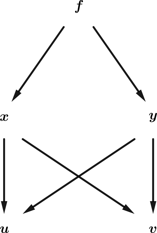 An easy way to remember such formulas is to use a tree diagram, as shown in the first diagram in Figure 8.2.1. To use a tree diagram, determine which derivative you want to take, in this case the derivative of \(f\) with respect to \(u\text{.}\) Now follow all possible paths from \(f\) to \(u\text{,}\) with each arrow corresponding to a derivative of the “top” quantity with respect to the “bottom” quantity, and where in each case the variable(s) not pointed to by the arrow are to be held constant.