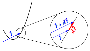 Figure2.2.1.The infinitesimal displacement vector \(d\rr\) along a curve, shown in an “infinite magnifying glass”. In this and subsequent figures, artistic license has been taken in the overall scale and the location of the origin in order to make a pedagogical point.