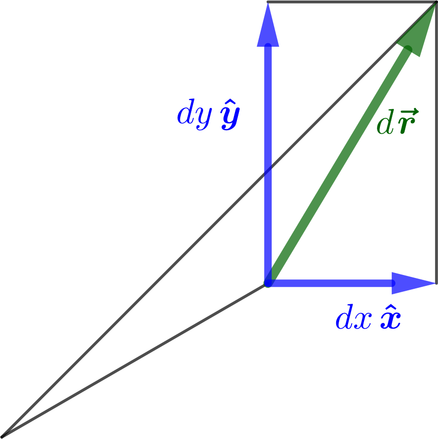 Like any vector, \(d\rr\) can be expanded with respect to \(\xhat\text{,}\)\(\yhat\text{,}\)\(\zhat\text{;}\) the components of \(d\rr\) are just the infinitesimal changes \(dx\text{,}\)\(dy\text{,}\)\(dz\text{,}\) in the \(x\text{,}\)\(y\text{,}\) and \(z\) directions, respectively, that is