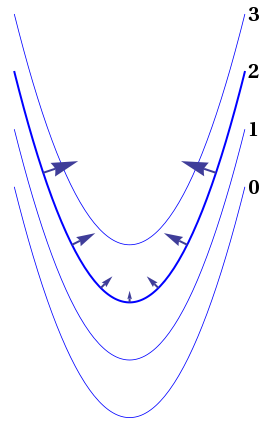 You can also visualize the gradient using the level surfaces on which \(f(x,y,z)=\hbox{ const}\text{.}\) (In two dimensions there is the analogous concept of level curves, on which \(f(x,y)=\hbox{ const}\text{.}\)) Consider a small displacement \(d\rr\) that lies on the level surface, that is, start at a point on the level surface, and move along the surface. Then \(f\) doesn’t change in that direction, so \(df=0\text{.}\) But then