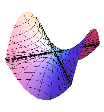 and set \(D=AC-B^2\text{.}\) Then if \(D>0\text{,}\) the term in square brackets is positive, and the graph of h is a paraboloid, which opens up if \(C>0\) (a min), and down if \(C\lt 0\) (a max), as shown in Figures 10.2.2 and Figure 10.2.1, respectively. If \(D\lt 0\text{,}\) then the term in square brackets is positive when \(x=0\text{,}\) but negative when \(y=-\frac{B}{C}x\text{;}\) this is a saddle, as shown in Figure 10.2.3. If \(C=0\) but \(A\ne0\text{,}\) a similar argument can be made replacing \(C\) by \(A\text{.}\) If \(A=0=C\) but \(B\ne0\text{,}\) then \(h=xy\text{,}\) which is easily seen to be a saddle. But if all of \(A\text{,}\) \(B\text{,}\) and \(C\) vanish, anything can happen; we need more information. Since \(D=0\) in this latter case, anything can happen if \(D=0\text{.}\)