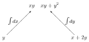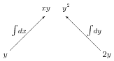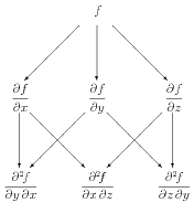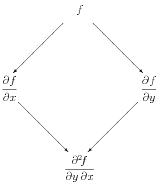 It is helpful to make a diagram of the structure underlying potential functions and conservative vector fields. For functions of two variables, this is shown in the first diagram in Figure 9.9.1. The potential function \(f\) is shown at the top. Slanted lines represent derivatives of \(f\text{;}\) derivatives with respect to \(x\) go to the left, while derivatives with respect to \(y\) go to the right. The second line thus gives the components of \(\grad f\text{.}\) The bottom line shows the mixed second derivatives, which can of course be computed in either order.