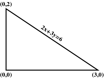 Let’s start with a simple example, and find the area of the triangle between the graph of the line \(2x+3y=6\) and the axes, as shown in Figure 3.7.1.