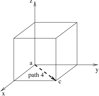 Given the unit cube shown below, find \(d\rr\) on path 4, leading from \(a\) to \(c\text{.}\) Then, use this expression to find the length of the line segment between \(a\) and \(c\text{.}\)