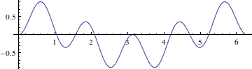 ¶What happens if you multiply two different trig functions, for example \(\sin(2\theta)\sin(3\theta)\text{,}\) as shown in Figure 9.3.1. It looks about as you might expect, with the overall structure (often called an envelope) of a large wave controlled by the function with the longer wavelength \(\sin(2\theta)\) and with smaller “wiggles” controlled by the function with the shorter wavelength \(\sin(3\theta)\text{.}\)