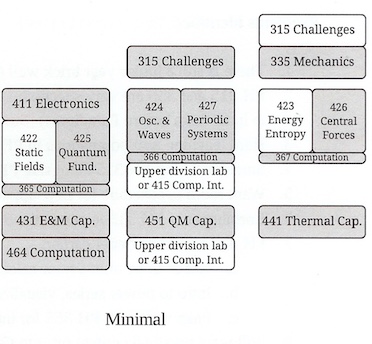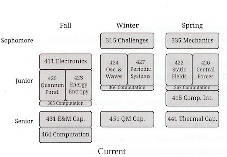 A white background in the diagram representing a minimal change indicates courses that were added to or changed in position from the current line-up. PH 422, Static Fields, for example, is shown as shifted from spring term back to the prior position it had had as the first paradigm during fall term before the major changes in instruction approved in 2016 were made. PH 423, Energy and Entropy, is shown as shifted from fall term to spring. Also added would be a second section of PH 315 spring term as well as an upper division lab (yet to be developed) or a computer interfacing course, both of which students could enroll in either as juniors or seniors.