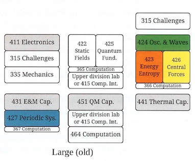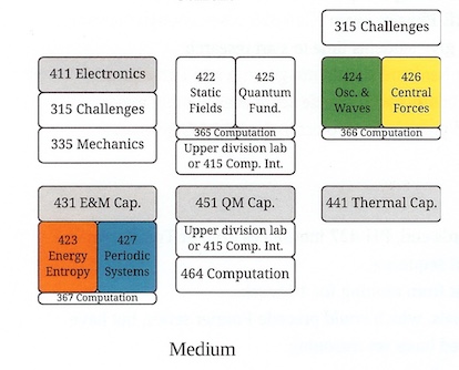 The first two paradigms in physics courses, PH 422, Static Fields and PH 425, Quantum Fundamentals, shown with white backgrounds, would be in the same order as shown in the minimal change, although during winter rather than fall term. The four other junior-level paradigms in physics courses were shown each with its own color to aid in keeping track of its position in the three major change options shown below.