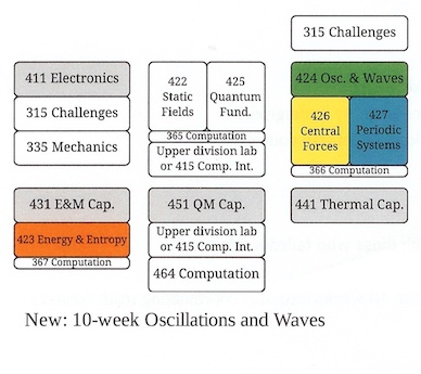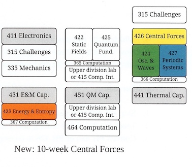 Next presented was a medium change with PH 315 and PH 335 both now to be offered fall term, still as 10-week courses, as shown in Figure 4.4.2. This change would shift all the junior-level paradigms in physics courses by one term.