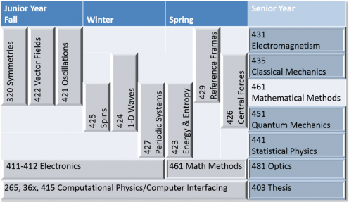 The current curriculum is shown below. The junior year paradigms courses are arranged to indicate the subject matter preparation they provide for the senior year capstone courses listed in the column on the right. Symmetries, for example, primarily draws on topics in electromagnetism, classical mechanics, and math methods. Information about the courses can be found at: http://catalog.oregonstate.edu/CourseList.aspx?subjectcode=PH&level=undergrad&campus=corvallis