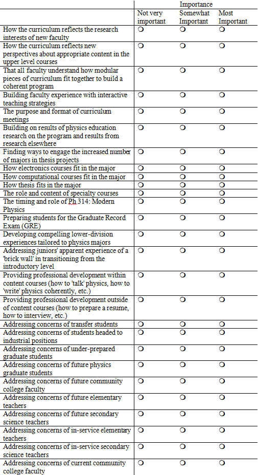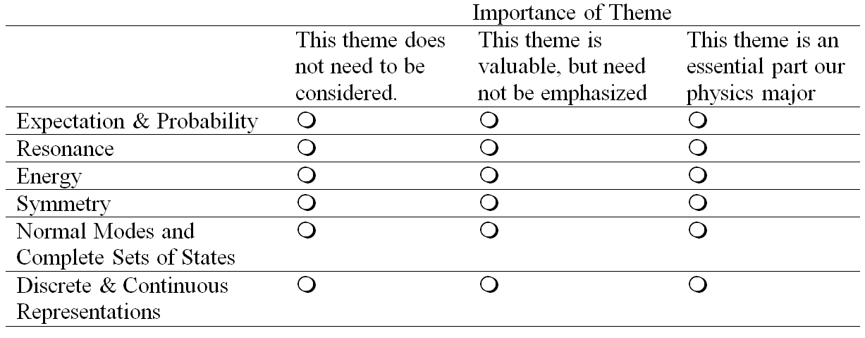 Through a long process of “card sorting,” the faculty organized the upper level curriculum to help students learn to think like physicists in multiple contexts. The junior level “paradigm” courses explore concepts such as central forces that are common to a variety of fields in physics. The senior level “capstone” courses focus on developing in depth understanding of traditional topics such as classical mechanics, electricity and magnetism, quantum mechanics, thermal dynamics and statistical physics, and mathematical methods. The faculty designed this upper level program to develop themes gradually cross the junior and senior level courses. Please rate the importance of the following themes.